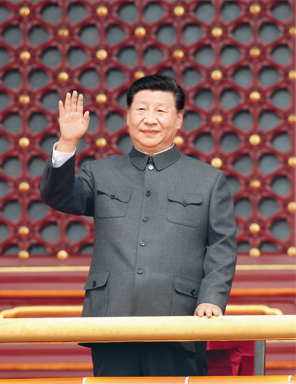 2019年10月1日,慶祝中華人民共和國成立70周年大會(huì )在北京天安門(mén)廣場(chǎng)隆重舉行。中共中央總書(shū)記、國家主席、中央軍委主席習近平發(fā)表重要講話(huà)并檢閱受閱部隊。這是習近平在天安門(mén)城樓上。 新華社記者 黃敬文/攝
